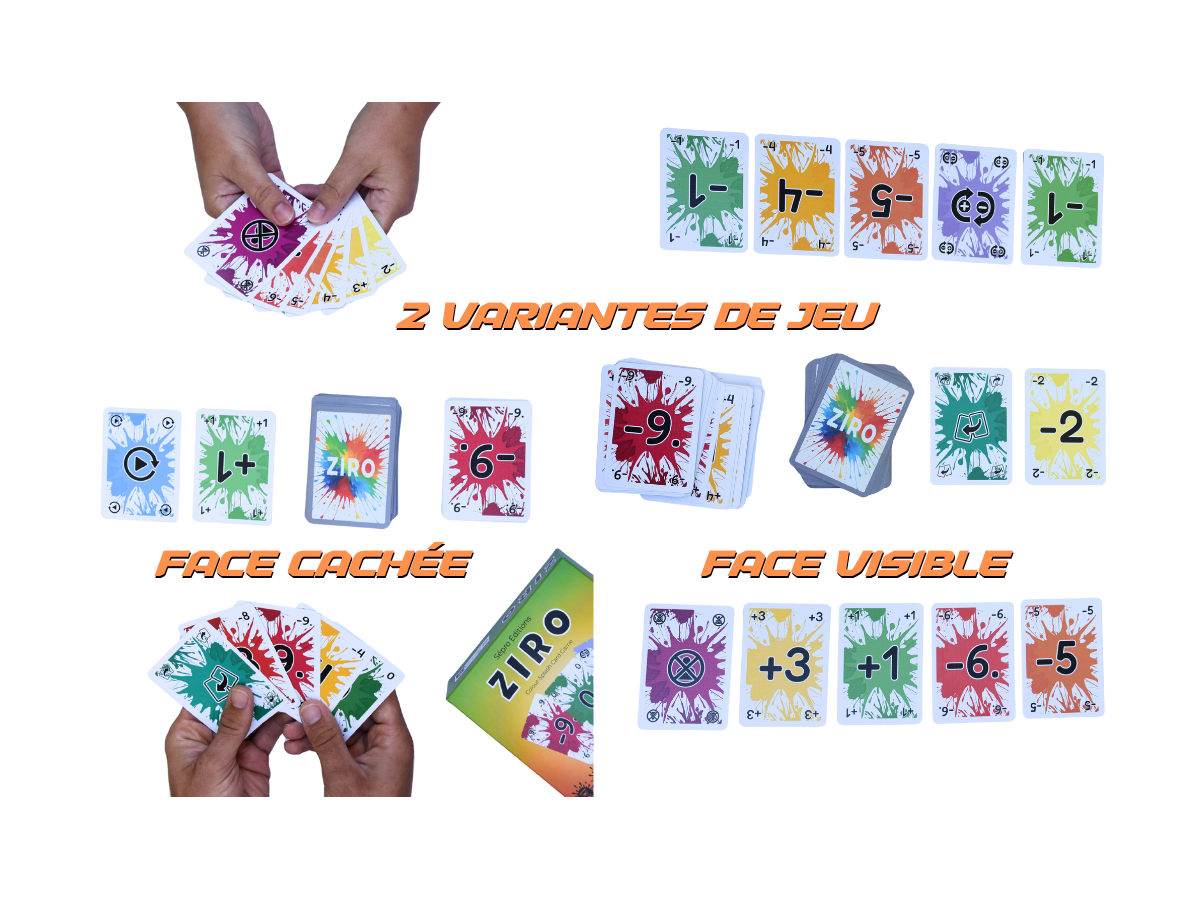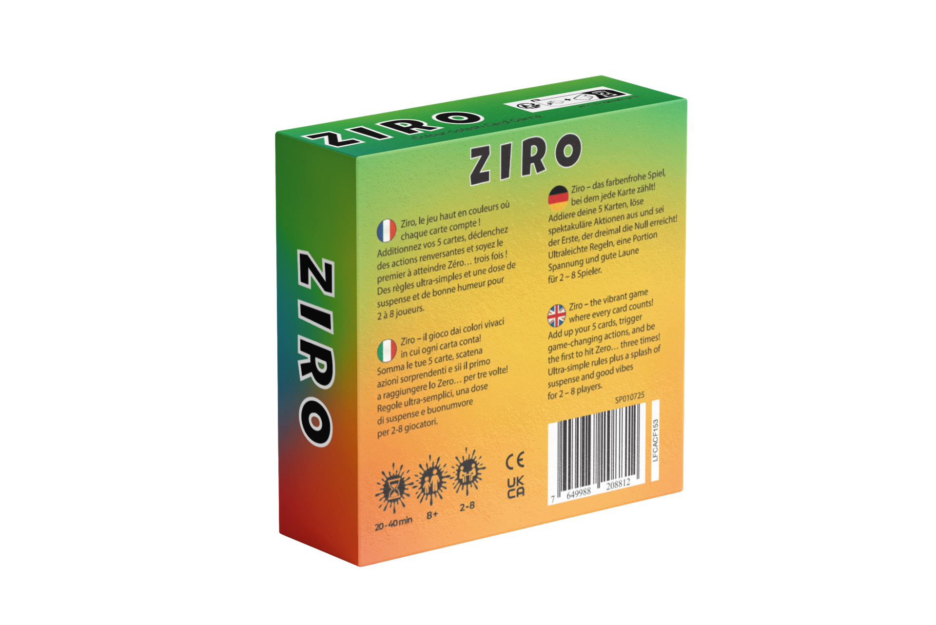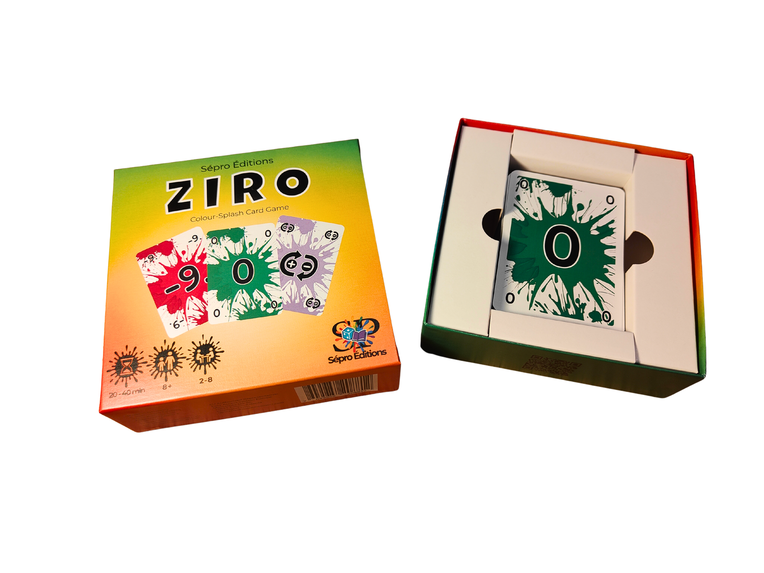 Ziro est un jeu de cartes familial rapide et amusant. Additionnez, soustrayez et jouez des cartes actions pour être le premier à réaliser 3 fois “Ziro” (la somme de vos 5 cartes = 0). De 2 à 8 joueurs, parfait à l’apéro, en voyage ou en famille.